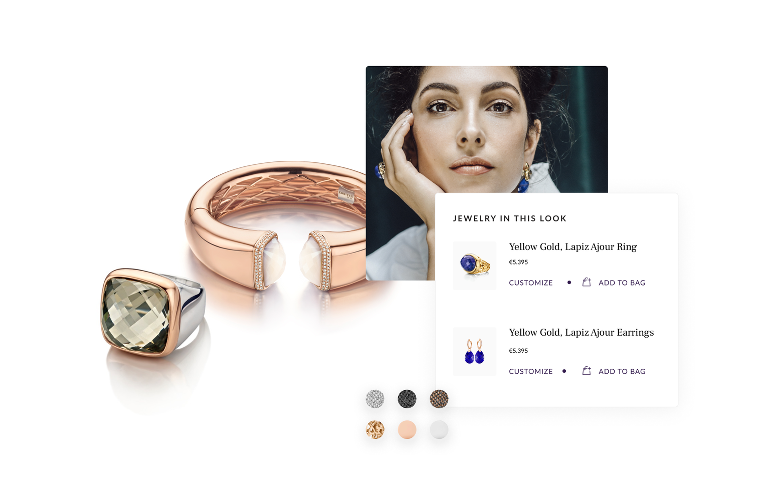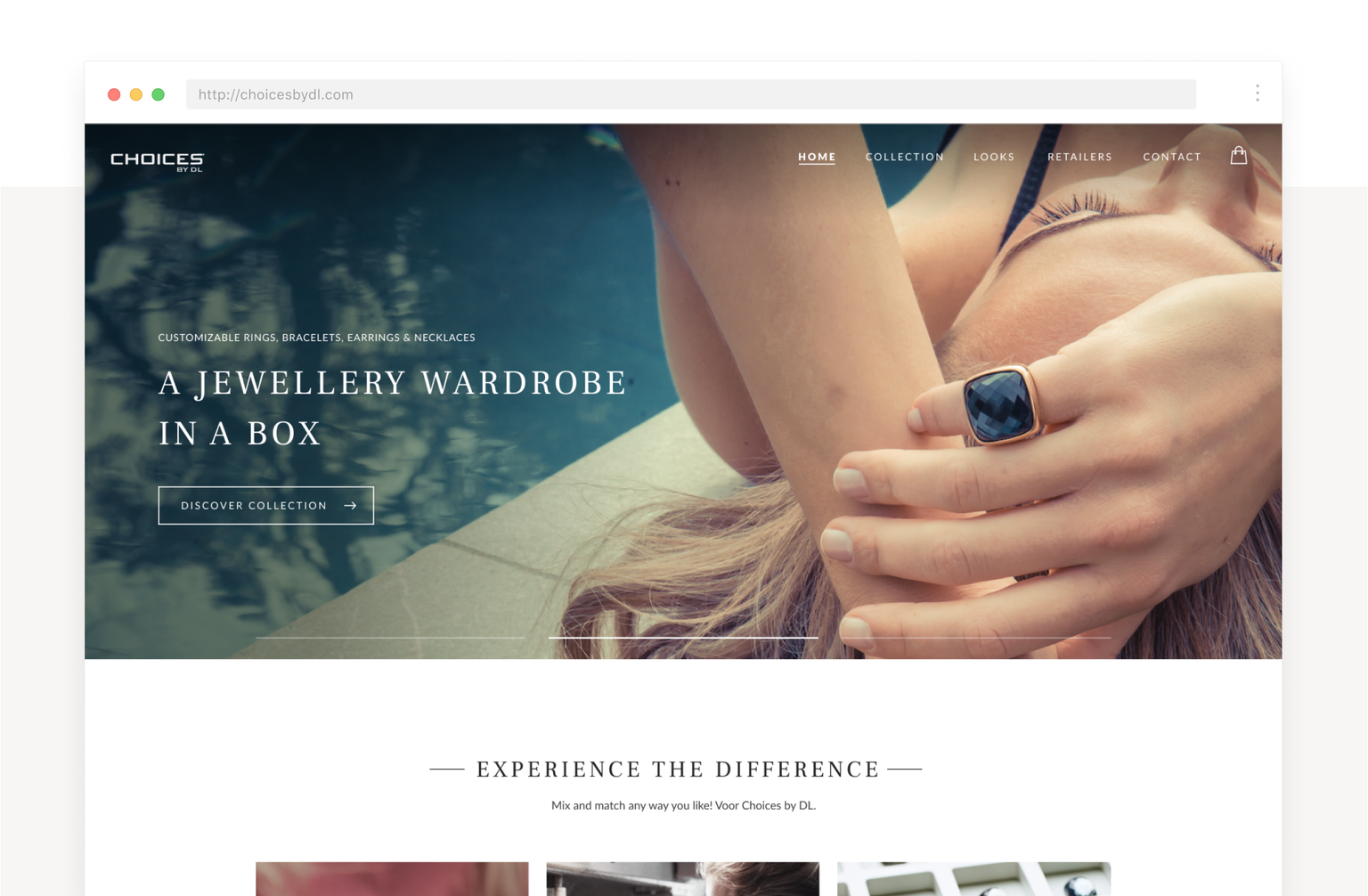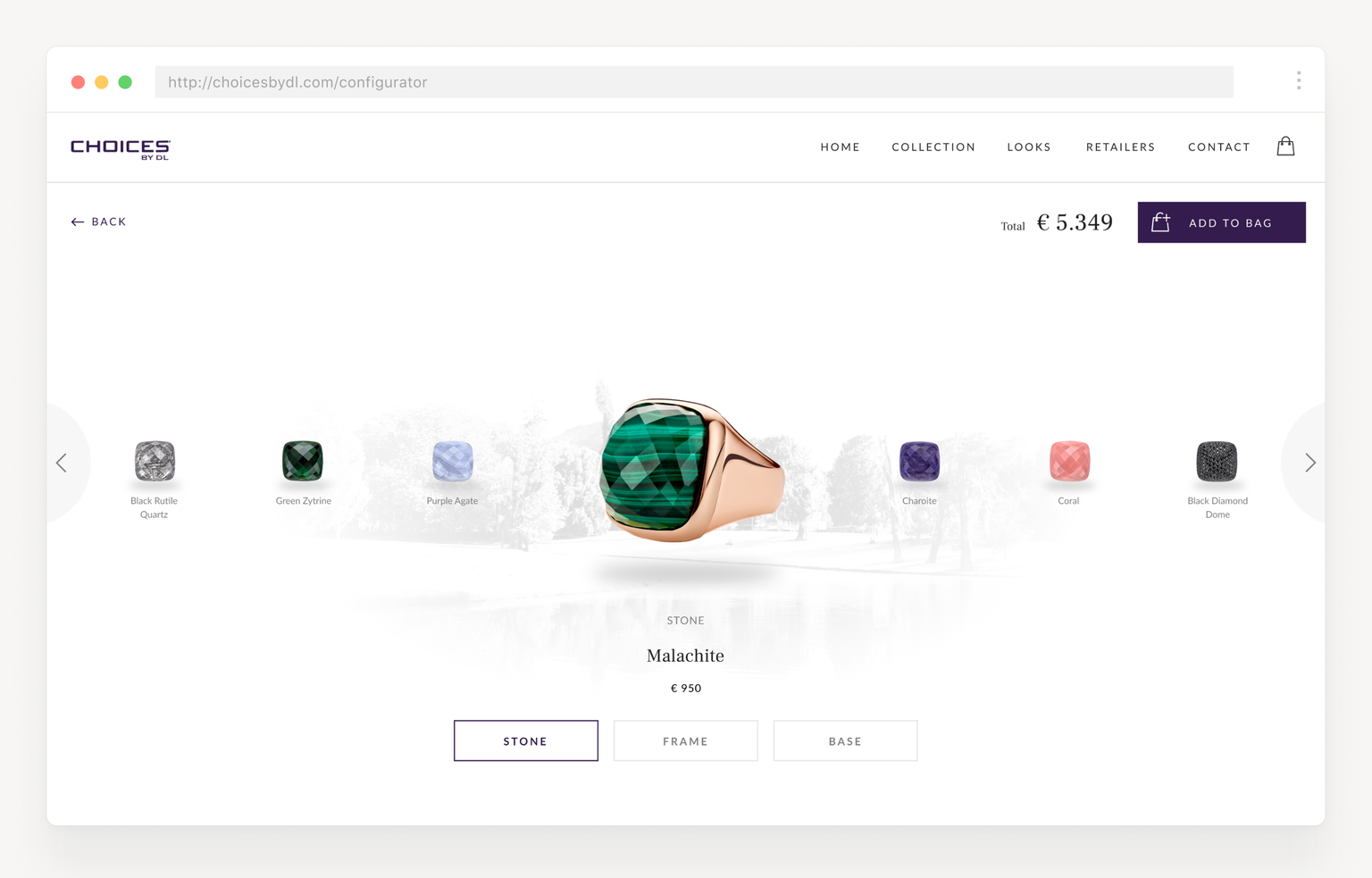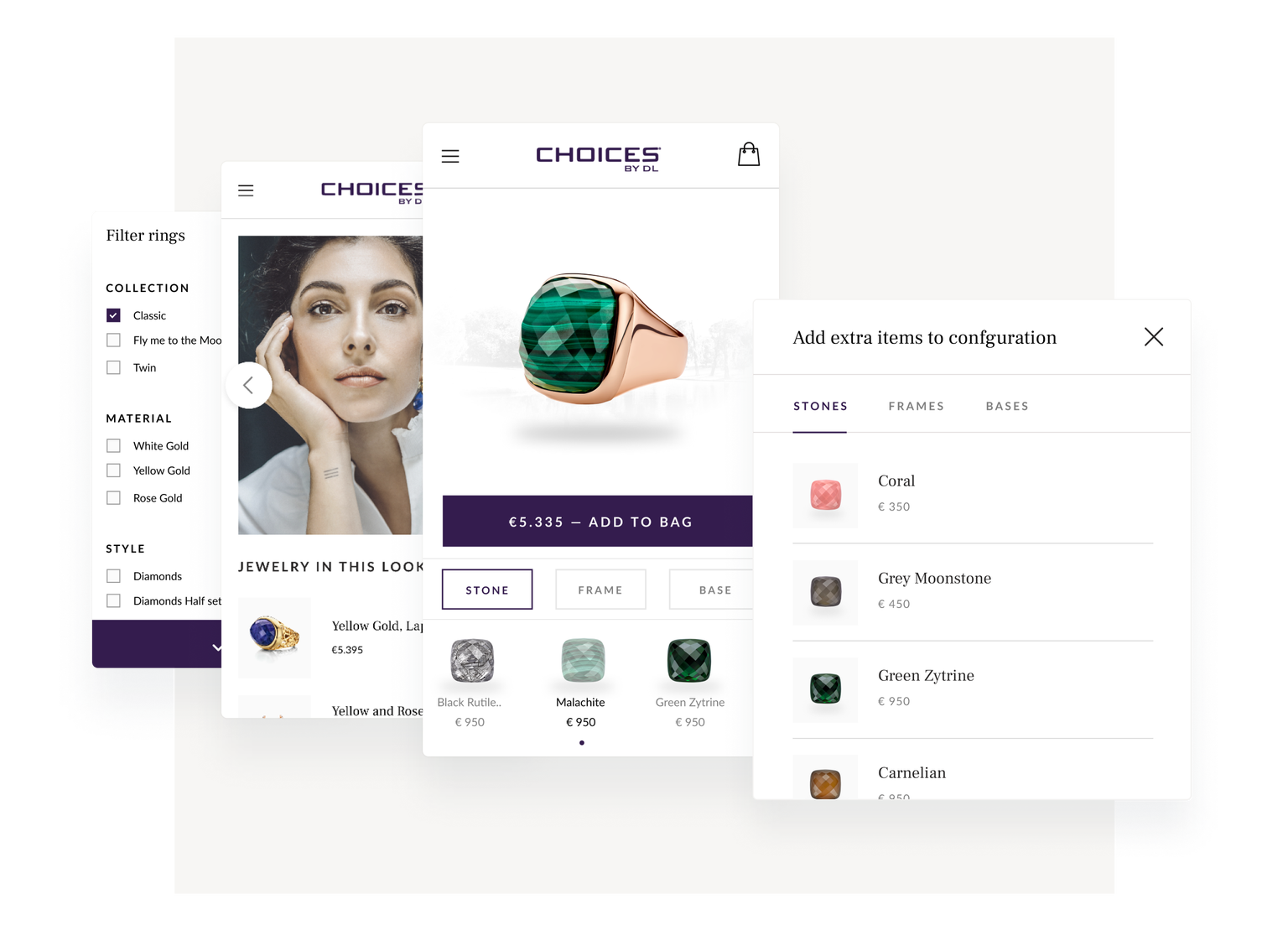 Professional photography combined with the latest web technology enabled us to build the Choices by DL Mix & Match concept. Using the configurator, you could make over four hundred thousand combinations and put together a unique ring as soon as it went live.