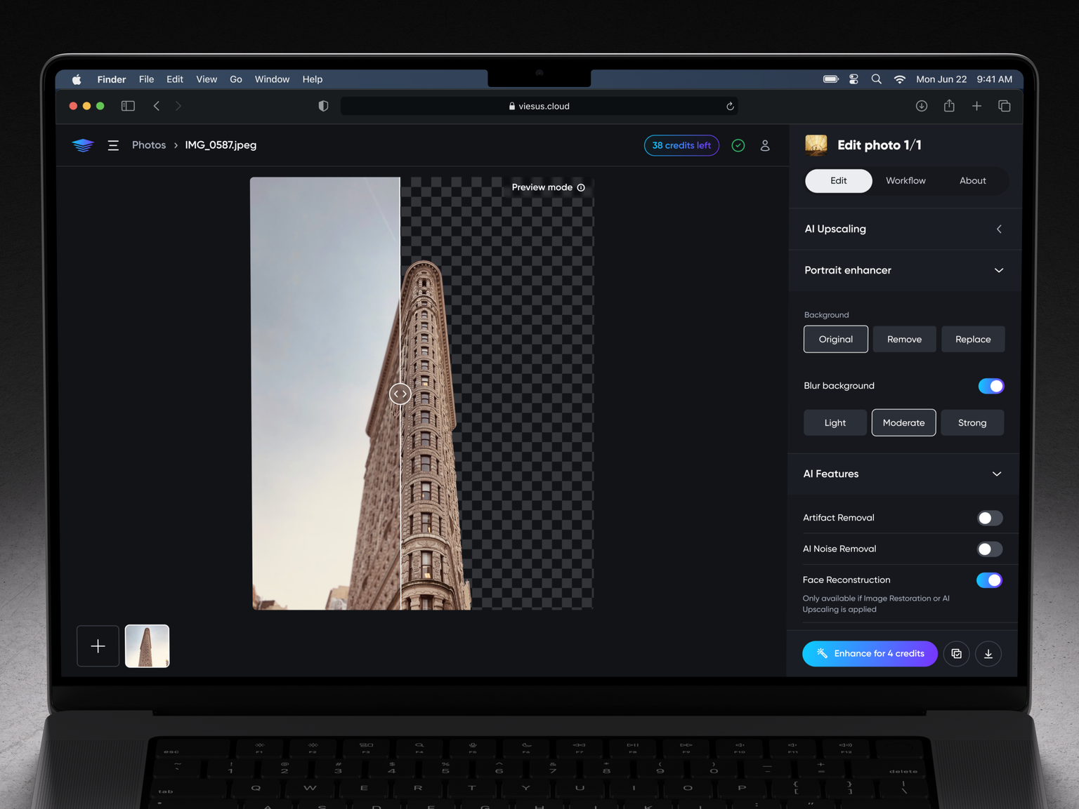 Viesus is about unattended automatic image enhancement. The features of the Viesus algorithm are made available in an easy-to-use interface and through an API. Viesus Cloud uses subscriptions and a credit system to charge users based on the type of enhancement.